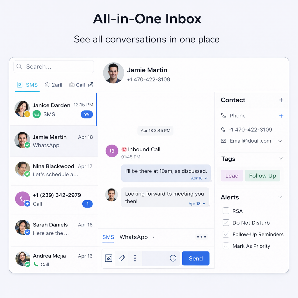 One Inbox, Every Channel – See all client messages—texts, DMs, web chats—in one clean, searchable thread.